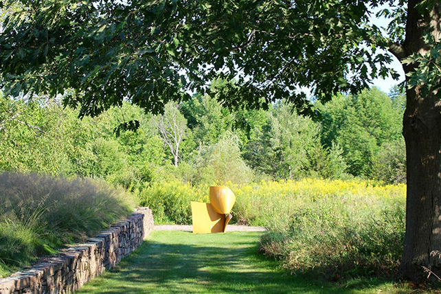 I have been gardening here for 41 years, but, thanks to the help of Danielle Giulian, I continue to make changes, refining the design, renovating older plantings, and beginning new areas. One goal is to have interest every month of the year. High summer is the start of the dahlias and phlox and other perennials. Our carefully assembled collection of plants includes more natives every year. I love finding interesting native cultivars like Liquidambar 'Slender Silhouette' but also enjoy the thrill of searching out exotic rarities. A meadow of Sporobolus heterolepsis (prairie dropseed) frames "Windblown Couch," a sculpture by Vivian Beer. Robert Murray's "Willow" is next to the pond, and "Portal" by Carla Edwards will entice you to take the path up a little hill. There is a beautiful big Franklin blooming behind the house. While I would definitely not call this a low-maintenance garden, we only occasionally water anything after the second year and fertilize only container plants. Compost suppresses weeds and feeds the soil without making it too rich. In spite of all the very tall perennials, we need very little staking. The garden was included in Jane Garmey's book, Private Gardens of the Hudson Valley.