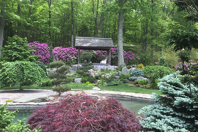 This Japanese garden is intended to evoke a sense of serenity, as different rooms invite the visitor to pause and reflect. Stones and ledges throughout reside harmoniously with specimen trees and plantings that marry color, texture, and shape. The water features induce a visual and auditory tranquility, encouraging meditation. From the teahouse, one has a commanding view of much of the garden with its borrowed Litchfield Hills landscape. Proceed through a stone garden to a series of geometrically patterned orchards and connecting footpaths. Garden is partially accessible.