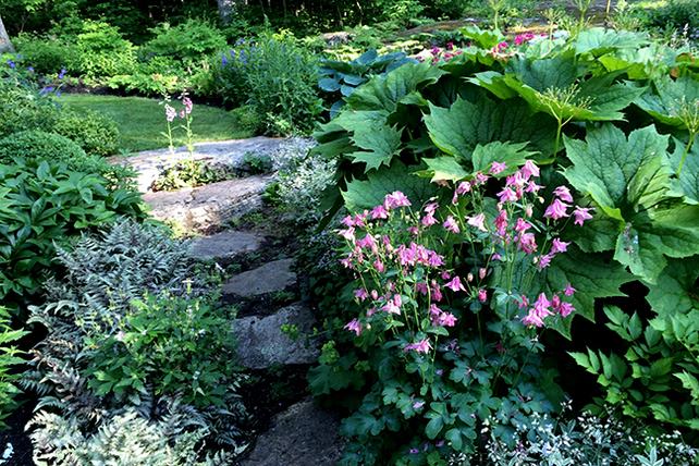 On the grounds of a family Arts and Crafts house built in 1928 is an idiosyncratic hillside garden incorporating granite ledge, steep ravines, placid greensward, and a wooded slope leading down to a lake. The gardens themselves are separated into two areas. First the well-mannered, level terrain of "Sissinghurst," with a decorous palette of blues, pinks, silvers, and purples, stone paths, and emerald lawn. Then "Margaritaville," a wild and rocky ravine with a riot of giant ferns, orange Tithonia, scarlet crocosmia, red salvias, and orange asclepias. Around the gardens are deep woods full of ferns and birches; within the garden is a small homemade frog pond. Here nature plays a larger part than nurture. At the front of the house is a fine view of the lake. The owner's grandfather was a nature writer, her parents were birdwatchers, and the owner writes about the natural world in her novels. The gardens are an attempt to make peace between the wild and the domestic, a response to the powerful surrounding landscape of dense woodlands, steep hillsides, boulders, and ravines.